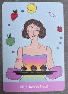 The sacred self-care card for this lunar cycle is “Sweet Treat.” There is no coincidence that I felt called to make chocolate chip cookies for my kids today. This card is a reminder that life is sweet. A sweet treat is an invitation to remember the sweetness of life.