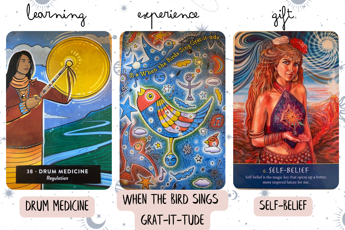 This leads us to the next card for this lunar cycle — “When the Birds Sing Grat-it-tude.” This card reminds us of the practice of gratitude. Practice gratitude for what has happened in your day over the last 24 hours. You can write it down in your journal, share it with your family, or say it to yourself in prayer — which is such a beautiful way to end the evening.