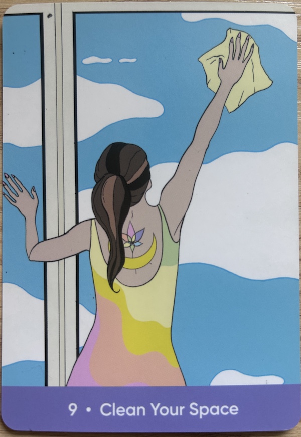 The sacred self-care card for this lunar cycle is to “clean your space”. Cleaning our physical space sends a message to the Universe on an energetic level—that we are creating room for something new and amazing to enter our lives.  Mother Nature is constantly cleaning her space with rain. We also know that how good we feel after cleaning up and arriving into a beautiful and uncluttered space. That’s what I mean that we need to put in the work (both inner and outer). Look around your space now and see where it needs some love and attention from you. Whether it’s your home or work space, if it’s a space where you spend a lot of time, it is worthwhile to take the time to clean the space and to fill it with beauty and love, so it can be YOUR sacred space to connect with your soul and Spirit.