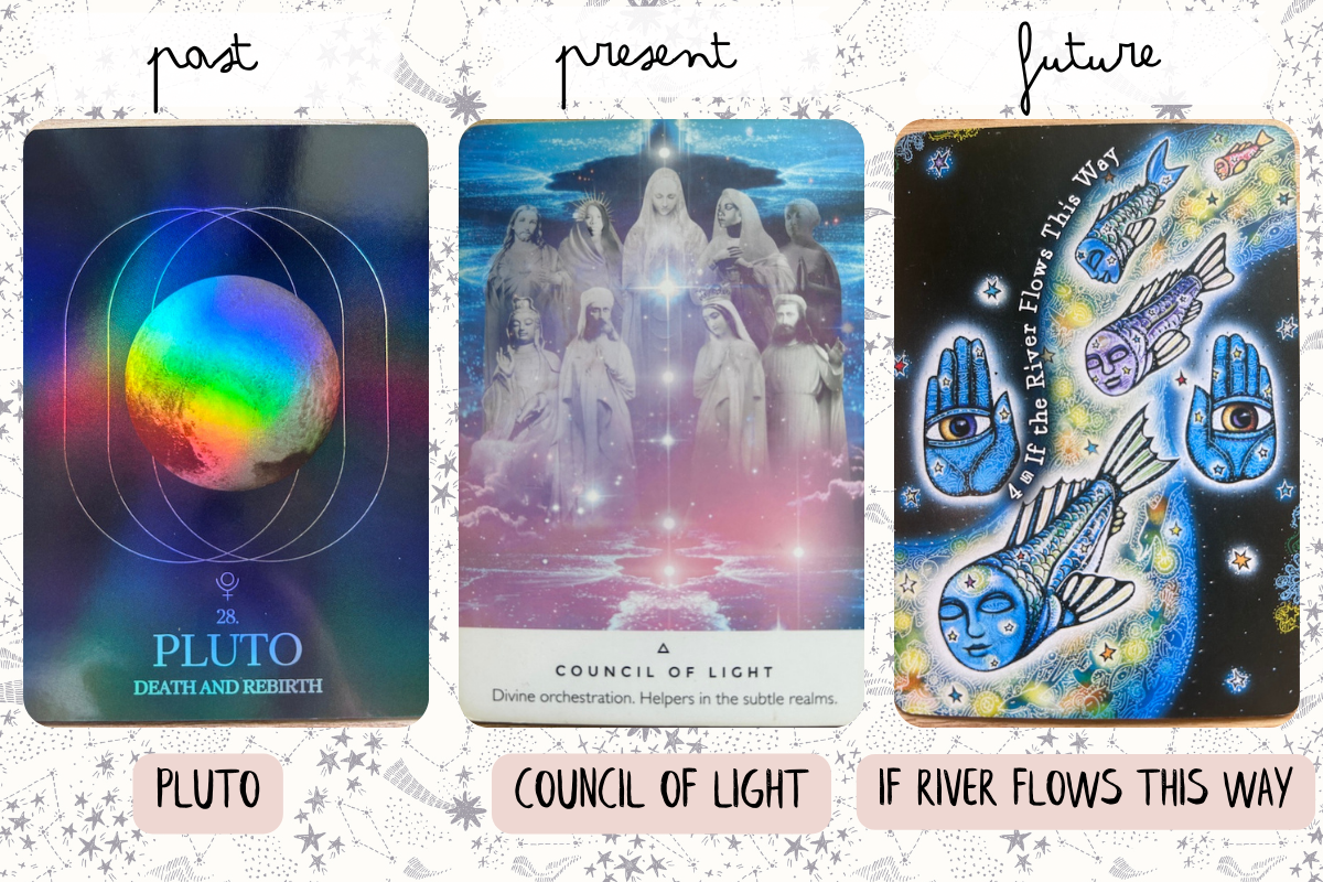 A 3-card reading shows the lessons from the past, present and future. Together these 3 cards can show a bigger picture of the energy arising for this particular lunar cycle and the topics that we should focus on.