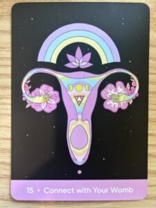 The sacred self-card card for this lunar cycle is to connect with our womb. On a symbolic level it also applies to men, as its meaning is to connect with our sacral chakra. The sacral chakra’s topic is about expressing our emotions and creativity, which aligns with the theme of living as our authentic self. In modern societies, both men and women are not encouraged to express emotions and creativity. In fact we are conditioned to mask our true feelings and to stop wasting time doing things that are not productive or not making any money.