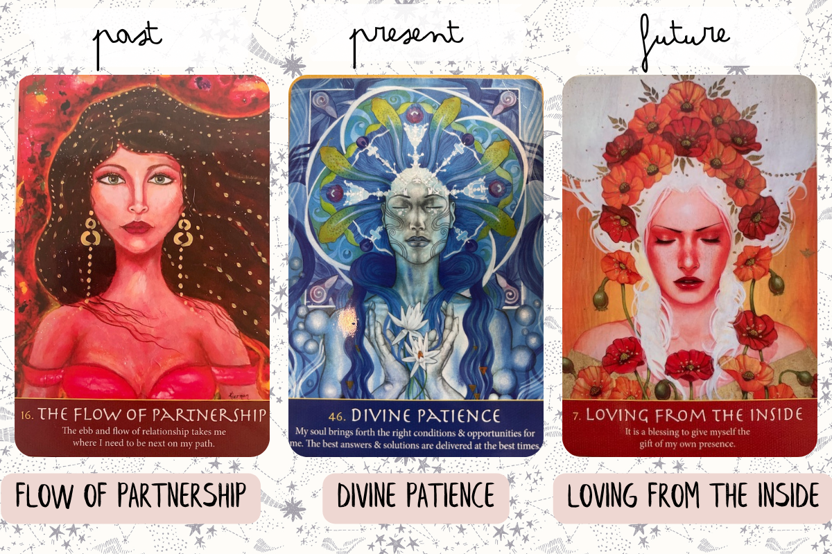 The future card shows “loving from the inside”. If we look at the transformation of the woman from the present card to the future card, even though her eyes are still closed, it feels like the leaves have now blossomed into flowers. The colors of the cards have also transformed from a cool tone to a warm tone with the red and orange. This feels to me that through this lunar cycle, as we are being patient with ourselves, as we are continually building trust with our intuition and strengthening our relationship with our soul, we are becoming more resilient and stronger from within. We are becoming more grounded with our spiritual presence, and this strength and beauty are radiating from within. We are becoming more confident to express our True Self, and our thoughts and actions are aligning with our soul’s purpose.